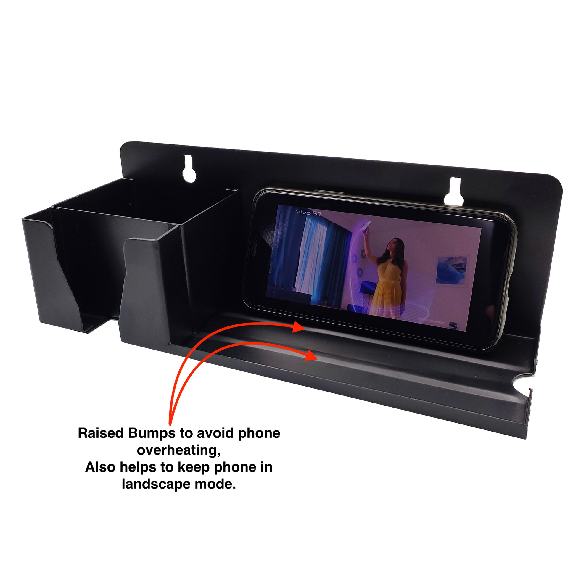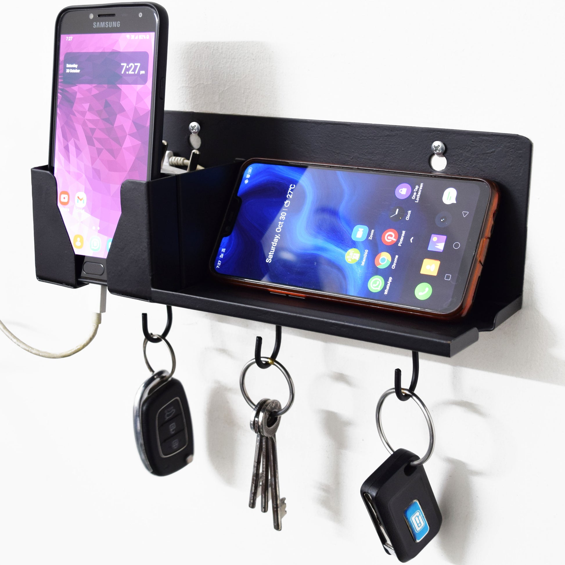 - VERY USEFUL: 3 Compartments - Keep Phone Vertically or Horizontally while charging. Hooks for Hanging Keys or other Accessories.